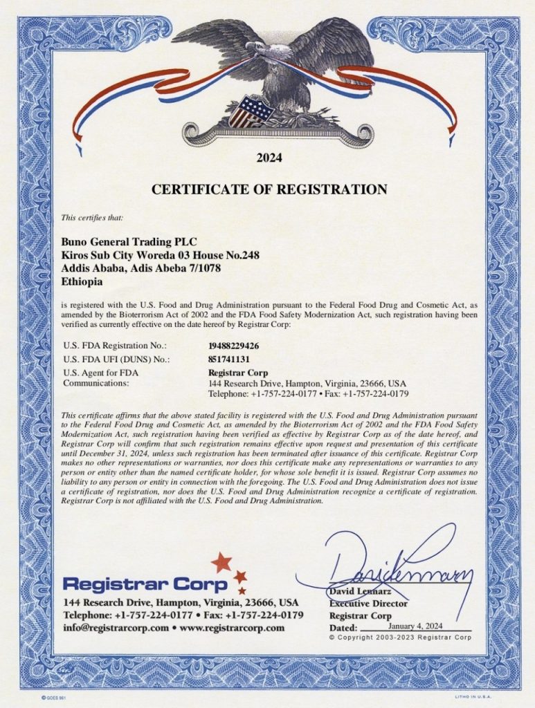 U.S FDA FOOD FACILITY REGISTRATION CECERTIFICATION